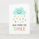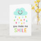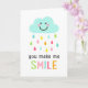 You make me smile friendship card featuring a happy cloud with colourful raindrops. Text on the front: You make me smile (black and colourful letters). Customisable text inside: You brighten my life. Thank you for being such a great friend! Tell your friends how much they mean to you with this fun card!
