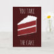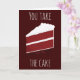 A “You take the cake” thank you card with a smiling, cartoon, slice of red velvet cake. The card is done in a red and white color scheme and has the words “Thank You” on the inside. The words are customizable. Add this card to your cart, so that you can thank someone special. And, thank you for choosing this design.