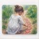 A young girl in a white dress places pink heart shapes along a pathway surrounded by lush greenery and blooming flowers