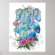 traditional watercolor and ink artwork of a young hippie god in the form of a blue elephant with floral ornaments as a decorative poster print