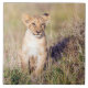 A young lion sitting beside a termite mound. This image was taken on a safari in Kenya, Masai Mara Game reserve. © Angelika Stern