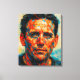 A dramatic portrait painting in an expressive style featuring a young man's face - closeup impressionist painting in oil style fluid brushstrokes in vibrant reds, oranges, yellows, and blue set the tone.