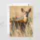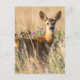 Photograph of a young roe dear surrounded by blue flowers and long grass.
