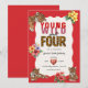 Roar into fun with this "Young Wild and Four" birthday invitation! Featuring adorable tigers and vibrant tropical flowers, this design is perfect for a jungle or safari-themed fourth birthday party. The playful "Young Wild and Four" text, set against a bold red background, captures the adventurous spirit of a growing child. The inclusion of a QR code on the back makes RSVPs a breeze for your guests. Celebrate this wild milestone with an invitation as unique and exciting as your little one!