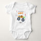 Young Wild And One 1st Birthday Kids Monster Car Trucks Birthday Baby Bodysuit features a cute and colourful monster car truck with the text "Young, wild and one" in modern typography script accented with the number 1 and doodles. Below personalise with your custom name. Perfect for baby's first birthday celebrations. Designed by Evco Studio. For coordinating items view www.zazzle.com/store/evcostudio