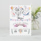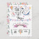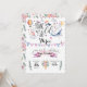 Elegant and modern floral birthday party invitation features a bouquet of soft pastel watercolor flowers, whimsical illustrations of whales, a llama, a unicorn, a hot air balloon, and adorable banner. Personalise with your birthday party details in elegant black calligraphy lettering.