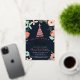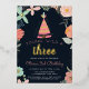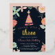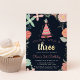 Adorable invitations for your wild one's third birthday feature a boho floral border and pink teepee illustration. "Young, wild and three" appears in gold foil lettering, with your 3rd birthday party details beneath, on a rich navy blue background accented with gold foil trim.