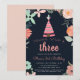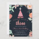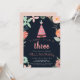 Adorable invitations for your wild one's third birthday feature a boho floral border and pink teepee illustration. "Young, wild and three" appears in peach lettering, with your 3rd birthday party details beneath, on a rich navy blue background.