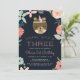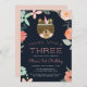 Adorable invitations for your wild one's third birthday feature a boho floral border and a sweet rosy cheeked bear wearing a feather. "Young, Wild and Three" appears in peach lettering, with your birthday party details beneath, on a rich navy blue background.