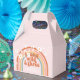 Retro inspired Young Wild and Three 3rd birthday party favour box with hippie style rainbow, daisies and boho fonts and colours.