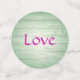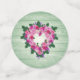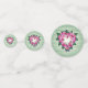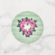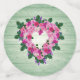 Pink roses in a heart shape wreath handing on a wooden wall painted pale green. A casual beautiful heart design that makes a beautiful theme for a bridal shower, wedding, anniversary, or Valentine's Day party.
