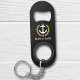 A Personalized Nautical Themed, Keychain Bottle Opener with your boat name, family name or other desired text. Featuring a custom designed nautical boat anchor, gold style laurel leaves and star emblem on navy black or easily adjust the primary color to match your current theme. Makes a great gift for any occasion.
