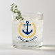 Personalised nautical themed whiskey glasses with your boat name, family name or other desired text. This custom design features a hand created boat anchor in navy blue accented with a gold coloured star and regal laurel leaves.