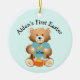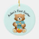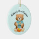 Personalise Your Child's Name First Easter Day Ornament 20xx, with a Teddy Bear holding a big turquoise heart, and an Easter Basket, and butterflies on his feet. All text customisable.