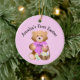 Personalise Your Child's Name First Easter Day Ornament 20xx, with a Teddy Bear holding a big turquoise heart, and an Easter Basket, and butterflies on his feet. All text customisable.