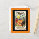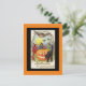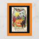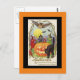 Cute vintage image of a black cat and witches around a pumpkin with an owl and bats overhead. Includes charming greeting.