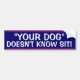 Blue bumper sticker with white lettering. Captions reads "YOUR DOG" Doesn't know sit. Top and bottom boarders has "yourdogdoesntknowsit" repeated in small pink letters.