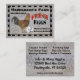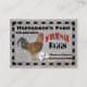 A country style design, with an image of a chicken on the left with chicken wire behind it, seven beautiful white eggs under the black and red text "FARM FRESH EGGS". There is a black chequered border around the outside, all on a weathered wooden board. Personalise the front and back of these fresh eggs, chicken farm business cards with your farm name, telephone number and business hours on the front of the card and your name, address, website and any words you like on the back.