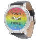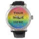 This custom watch template with semi-transparent yellow numbers (30% sheer) adds a nice colour accent to your background image or photo. The drop shadows give the numbers in this flat printed timepiece an embossed, almost 3D look. This design goes especially well with gold, red, orange, and other warm-coloured backgrounds. It also blends in very nicely with green and other cool-coloured backgrounds.