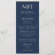 This elegant and modern wedding menu features a navy blue background. Two sample initials are printed in the top portion in a pale grey font. You can personalise to menu to include your own initials and custom food options. The bottom portion of the menu features three courses with two options each. You can replace the menu items with the food options of your choice. The back of the menu is a matching navy blue colour. It's suitable for breakfast, brunch, lunch, or dinner events.