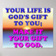 YOUR LIFE IS GOD'S GIFT TO YOU; MAKE IT YOUR GIFT TO GOD. This colourful image is a source of great inspiration and encouragement to all God-believing Christians. It simply says that just as God has provided us the gift of life, we should live our lives for him. Because after all, He is the only one who can create life! Order your copy of the poster with beautiful image on it today!