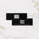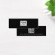 Black jewelry earring mini product display card with centered custom logo template and QR code on the back. The earring guides can be adjusted by adding and removing spaces in the template field, and by moving the whole element in the design tool.