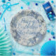 Easily change the birthday message using the text template provided. This is nature, abstract photography of frost frozen on a blue metallic background with a bokeh effect between the white flakes. This frozen winter macro photo will be a unique design for all occasions; just change the text to match the event.