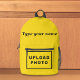 Yellow colour backpack that you can customise to put your name and photo. Please check the appearance after typing your name and uploading your photo. If the appearance is pleasing to you, you can place your order now. If you need to resize and move your name and photo to fit in the template or according to the appearance that you prefer, please change in the design tool. Examples of changes that you can make in the design tool are changing the background colour, font colour and font style. Personalise it. Have your name and photo on it. Backpack to conveniently carry your stuff anywhere. Backpack as camping bag.