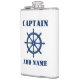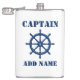 Your Personalised Name or Text on a Custom Captains Flask with A nautical Ships Wheel Helm in Navy Blue and White.