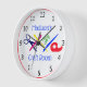 This is a white clock with a red border and black numbers, decorated with crafting tools (scissors, pen, artist paintbrush, sticky tape holder and paper clips). You can personalise it with your own name and words.