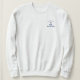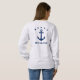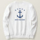 Stylish womens sweatshirt with a custom classic ship's anchor, 5 stars and your personalised name, boat name or other desired text in navy blue on light grey. Printed on front and back. Choose from multiple colours and make adjustments to match your boat gear. Makes a great gift for any occasion. Perfect for any time of year.
