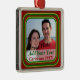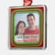 Customise with your own special photograph or image on this great Christmas colours of red, green and gold border design elegant holiday premium ornament. Room for your custom text, names, and date on the semi transparent label on the bottom of the ornament. Nice keepsake and favour for holidays, weddings, family reunions, birthday parties, thank you, anniversary, save the date, special events, etc. Shown is the popular square shape premium ornament with a matching red ribbon included to hang the ornament. Great keepsake gifts for kids, teens, and men and women of all ages!