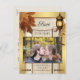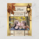 A romantic and artistic Save the Date postcard featuring your own favourite photo framed by a gold and weathered wood design with colourful autumn leaves and festive and warm lantern light.