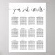 Wedding guest seating chart in classic black and white features "your seat awaits" at the top in whimsical handwritten calligraphy script lettering, with your guest table assignments beneath. Space provided for up to 12 tables.