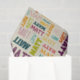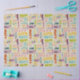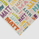 Create a very extremely personalised tissue paper. Your custom name appears all over this paper in a collage of different fonts and lettering styles. Lettering in teal, mint green, blue and yellow is set against a navy blue background.