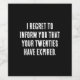 Say goodbye to your twenties and hello to fine wine and back pain! This hilarious wine label is the perfect addition to any 30th birthday celebration, making every bottle a fun and memorable gift. Whether you're toasting to adulthood or just trying to survive it, this label adds the perfect touch of humour. I regret to inform you that your twenties have expired, 30th birthday,  birthday, party, funny Wine Label