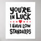A cunning pick-up line or a gently insulting put down - it's up to you! You're in luck I have low standards is a sarcastic dating quote that can have a whole range of different meanings.