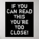 A funny quote in a distressed font. The phrase reads: If you can read this you’re too close.