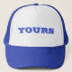Custom Trucker Style Baseball Cap Hat In Blue and White Coloured printed with YOURS in Blue text typography lettering and digital graphic design by TheFabricSeal print on demand shop at Zazzle.com #ZazzleMade https://www.zazzle.com/store/thefabricseal TheFabricSeal©️Original.