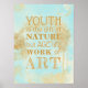 "Youth is the gift of nature, but age is a work of art" quotation. Positive quote to celebrate getting older! This design features gold colored mixed typography with a thin white drop shadow on a background in tints of blue green and faux gold glitter. Design © 2018 Nancy Lalonde