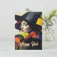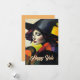 A Yule and Winter Solstice card featuring a witch with red hair and black hat. The front says: Happy Yule. The back says: And Winter Solstice. This is a flat card, two-sided card.