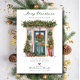 This festive moving announcement features the saying "Merry Christmas from Our New Home" with a beautiful watercolor green front door adorned with Christmas trees, pine garland and wreath. The announcement is perfect for sending to friends and family during the holiday season to let them know about your new address. The front of the announcement features the saying and watercolor green front door, and includes your new address and contact information. The overall design is festive and inviting, and the announcement is sure to put a smile on the faces of your loved ones.