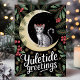 Wish someone a purrfect holiday with this enchanting Yuletide card featuring a cute cat sitting on a crescent moon. Surrounded by festive holly and pine branches against a starry night sky, this whimsical card brings holiday cheer with an extra touch of feline charm. Perfect for cat lovers and anyone who enjoys a touch of magic during the festive season.