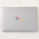 Contour sticker with an illustration of 3 different ice cream treats. A blue-green popsicle with strawberry drippings and colourful sprinkles. A watermelon popsicle. A cone with layers of delicious ice cream in pink and mint. All with cute kawaii smiles.