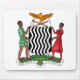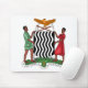 The coat of arms of Zambia was adopted on 24 October 1964 when the Republic of Zambia reached its independence. The African fish eagle represents the conquest of freedom and nation's hope for the future. The equiment represents the country's economic backbone: agriculture and mining, as well as the characteristics that have influenced Zambia's evolution and nature. The shield is a representation of Victoria Falls with white water cascading over black rock. The Victoria Falls represents the Zambezi river, from which Zambia takes its name. The coat of arms also has emblems of Zambia's natural resources: minerals and mining, agriculture and wildlife. The shield is supported by two figures which represent the common man and woman of the nation. The country's motto is "One Zambia, One Nation