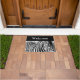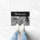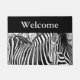 Zebra close up print - text "Welcome" . Funky doormat in black and white with the original art by Alma Wad . Great at any home where retro style items are appreciated .