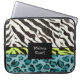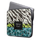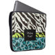 This wild and fun leopard print computer case sleeve art is new and contemporary. Featuring stylised, hand watercolored zebra and leopard print art which was hand painted. The top print is a white and black Zebra stripe, with lime green and black narrower ribbon and a bottom pattern of blue leopard print. Your name goes in the black tag in the centre of the design. There are several colours of leopard print and zebra print available. Your name or names personalise the case. There are also I-Phone and I-Pad cases to match. If we don't have the case you're looking for just email us and we'll make it for you.