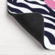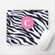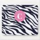 A square mouse pad that has a black/white zebra pattern with a pink monogram design in the centre. You can personalise this product with your name or initial by using the custom template.