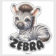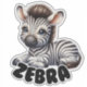 The zebra's ears are perked up, showcasing its alertness, and its mane is styled with a touch of brown, adding warmth and contrast to the classic zebra pattern. The bold, black, bubble-style text below the zebra spells out "ZEBRA," giving the sticker a fun and approachable vibe.