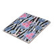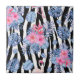 A modern black and white zebra print overlaid with a tropical pink and blue hibiscus and flamingo pattern.
